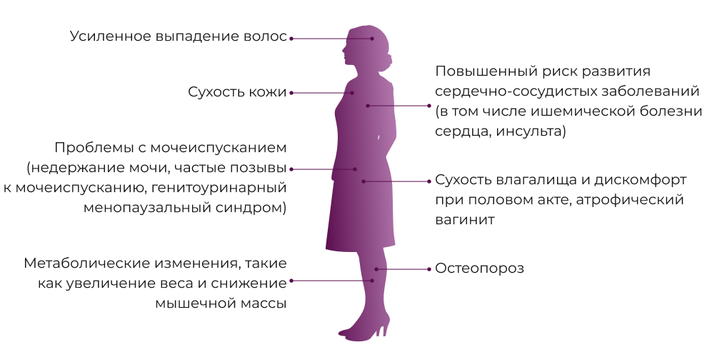 Изменения затрагивают все системы организма, которые чувствительны к женским половым гормонам — эстрогенам: мочевыводящую систему, кости, мышечную ткань, кожу, а также сердце и сосуды.