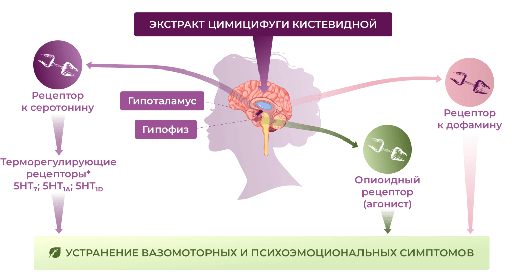 Экстракт корневищ цимицифуги кистевидной не является фитоэстрогеном в классическом его понимании и действует через рецепторы серотонина, дофамина и норадреналина в головном мозге.