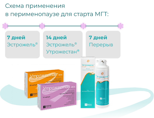 - ДУЭт Утрожестан® (микронизированный прогестерон) + Эстрожель® (трансдермальный 17ß-эстрадиол) — это МГТ для женщин в любом периоде менопаузы, с разной степенью симптомов.