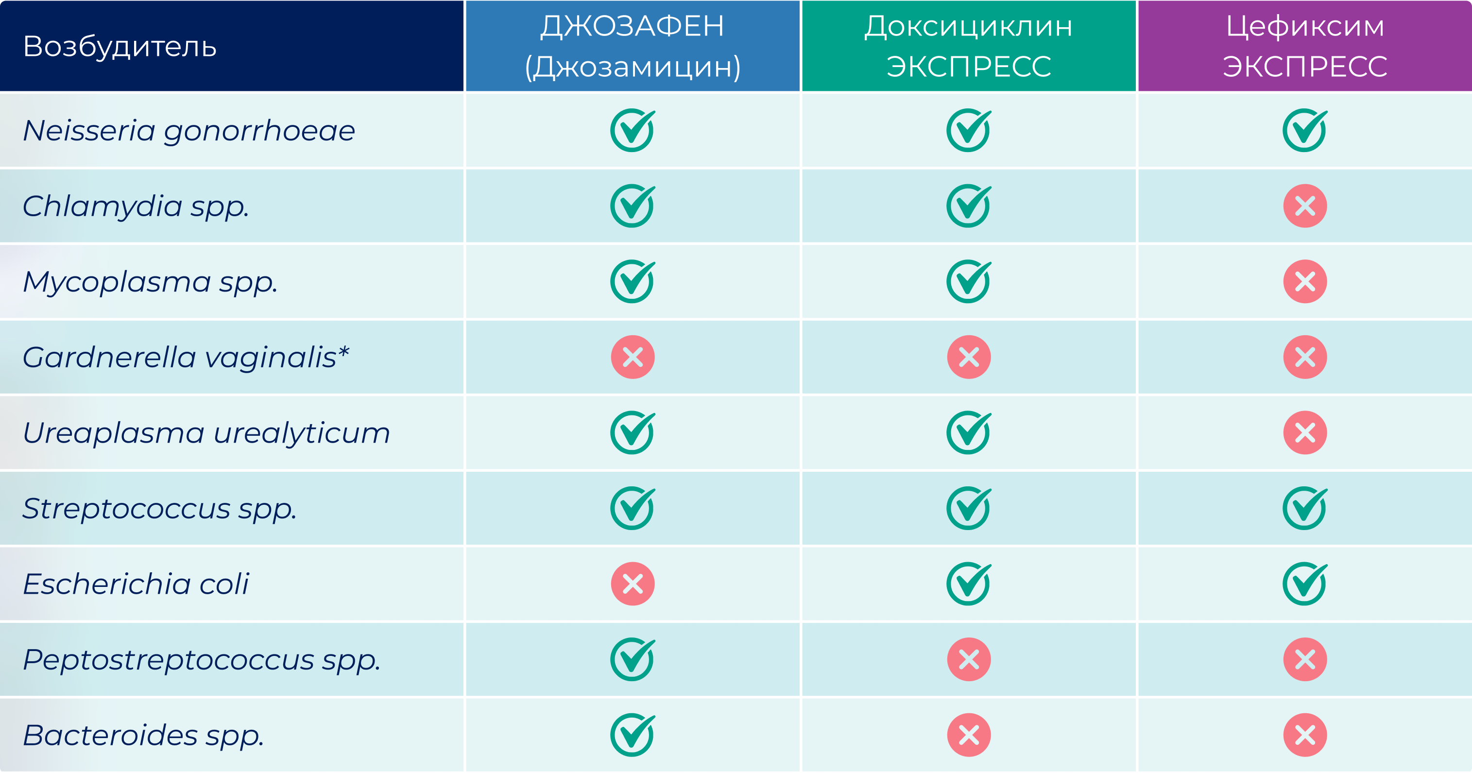 - Джозамицин (джозафен) показал высокую антимикробную активность против возбудителей урогенитальных инфекций (C.trachomatis, M.genitalium, U.urealyticum, M.hominis) по сравнению с фторхинолонами.[8-13]